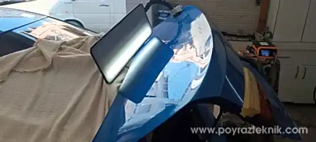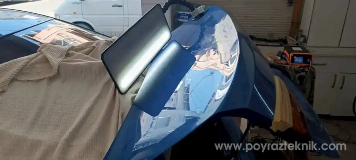 PDR teknikleri ile doğrultma: Hasarlı bölge, klasik çekiçleme yöntemleri yerine PDR (Boyasız göçük düzeltme) teknikleri kullanılarak, sacın yapısı bozulmadan hassas bir şekilde doğrultulmuştur. Bu sayede macun kullanımı minimuma indirilmiş ve pürüzsüz bir zemin hazırlanmıştır.